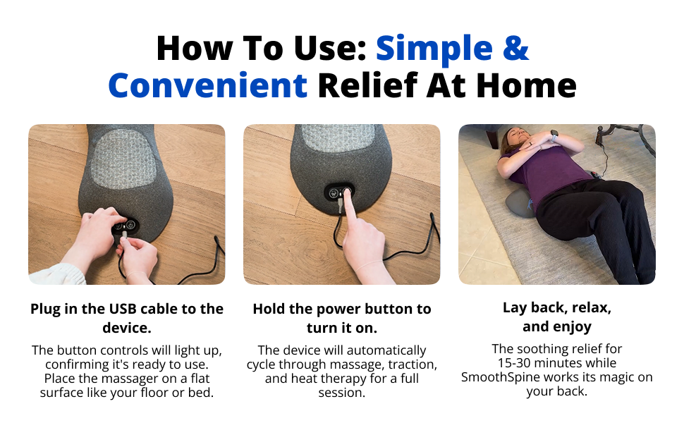 Simply get yourself aSmoothSpine Triple Fusion Massagertoday, use it for 90 days, and then make your decision based on the results.If you are not absolutely thrilled with the relief, we will issue you an immediate refund.